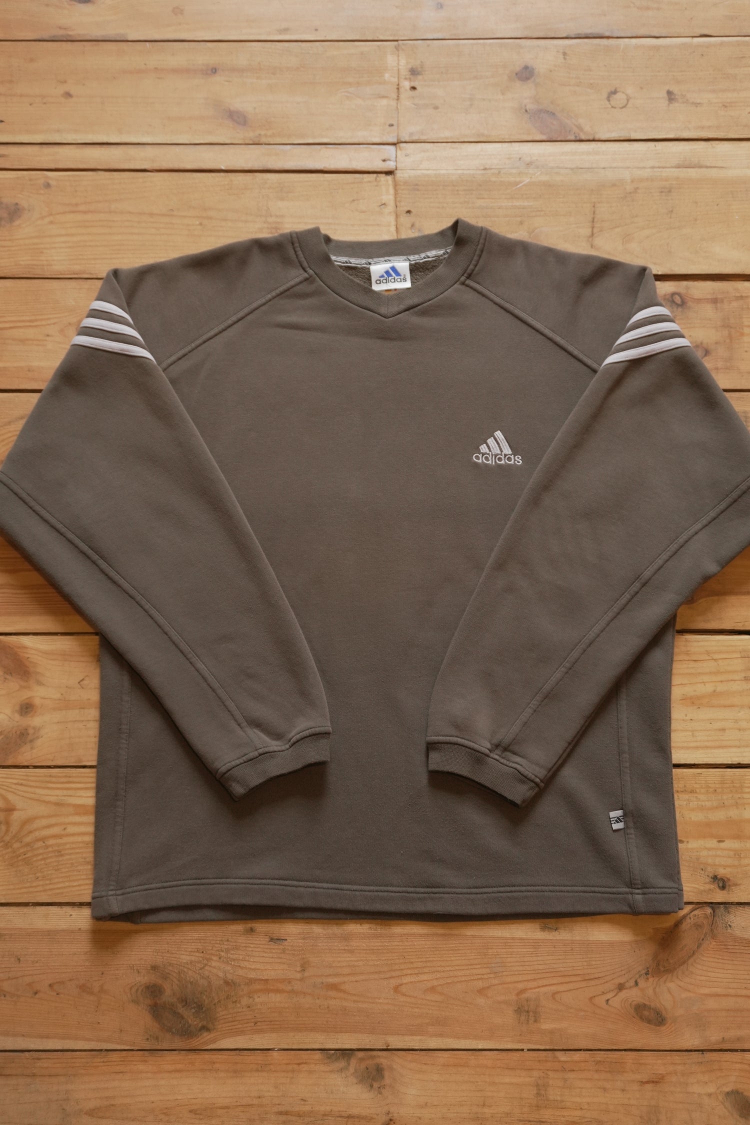 Adidas Sweatshirt Olive Khaki Green Grey Arm Stipe Men's XL Long Sleeve V-neck