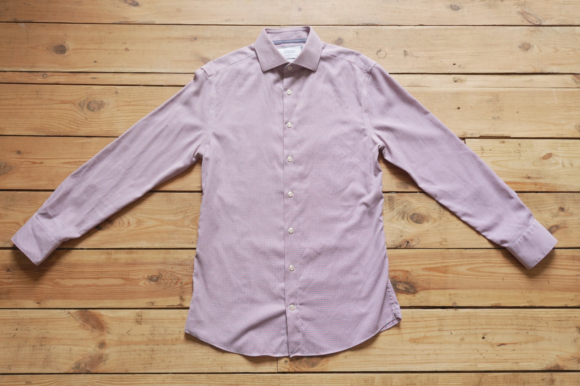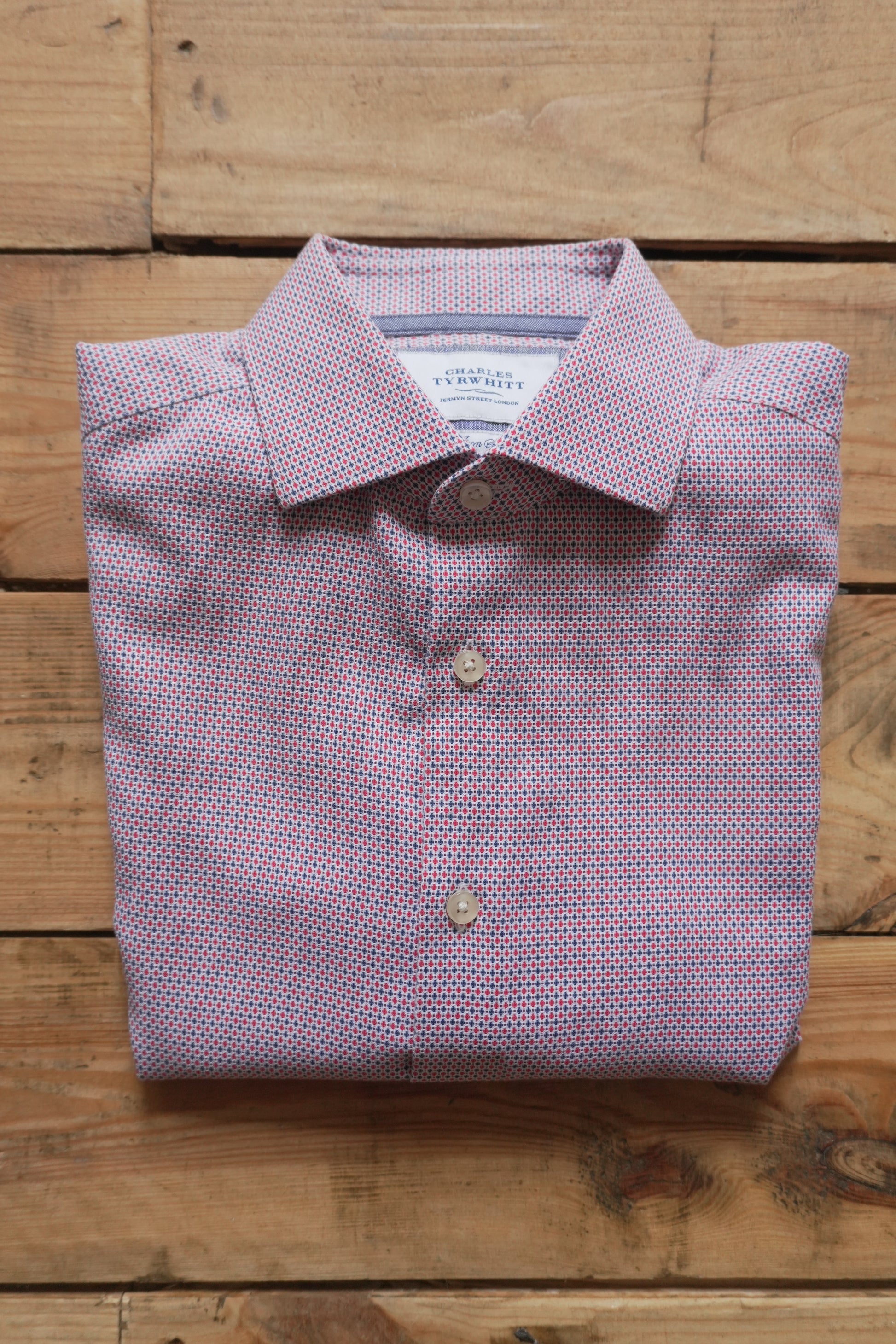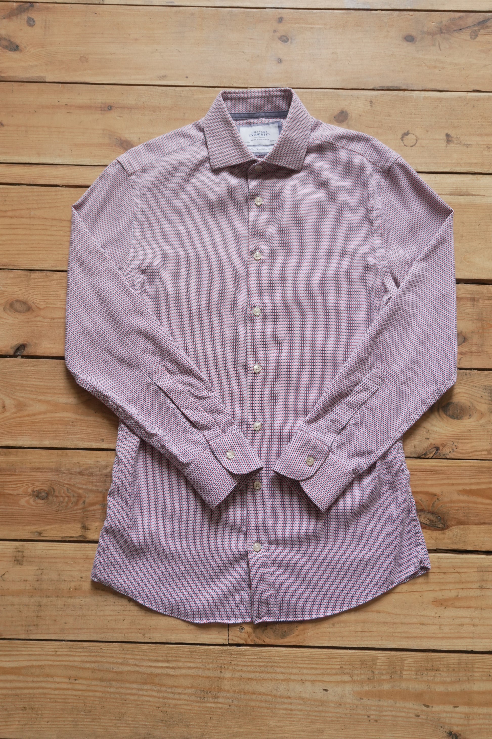 Charles Tyrwhitt Shirt Slim Fit Non Iron 15 1/2 Inch Men's Medium Red Blue Dot Geo Print Long Sleeve